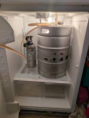 Whirlpool Refrigerator, custom fitted with full keg-o-rator kit. Tap, lines, Co2 bottle, regulator, and will include a keg shell. Fridge runs very cold. Freezer works, as well. Stickers come free!...