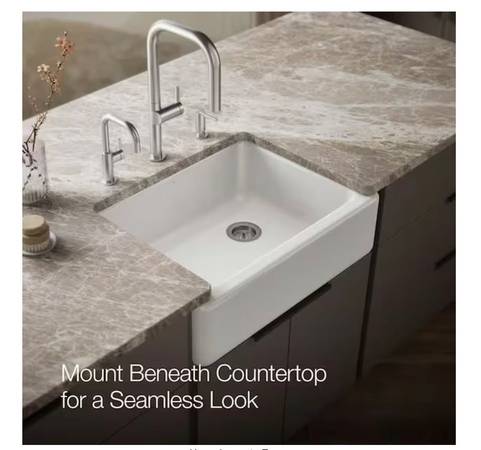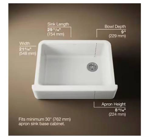 The Whitehaven apron-front kitchen sink features a streamlined and versatile farmhouse style. The Self-Trimming design requires only a simple rough cut, overlapping the cabinet face for beautiful results. The tall integral apron also acts as a drip edge to protect the cabinet from water damage. A large single basin accommodates large pots and pans, while the sloped bottom helps with draining and cleanup. Crafted from enameled cast iron, this sink resists chipping, cracking, or burning for years of beauty and reliable performance.