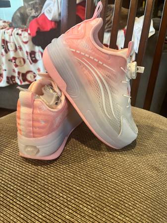 Two pair of skate shoes for sale. The pink and purple pair light up the second pair look like Converse these ones are the pink and white pair. Both are skate shoes