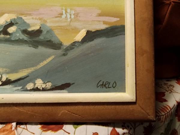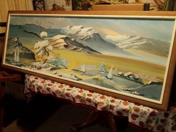 Beautiful landscape painting by Carlo of Hollywood. Done in the 60's this is a great example of his work. It's a very large painting at 5 feet, 4 inches long by 2 feet tall. Has minor wear and imperfections from age but overall is stunning. Done in a surrealistic, Salvador Dali style. Id interested please contact me through Craigslist. Thanks.