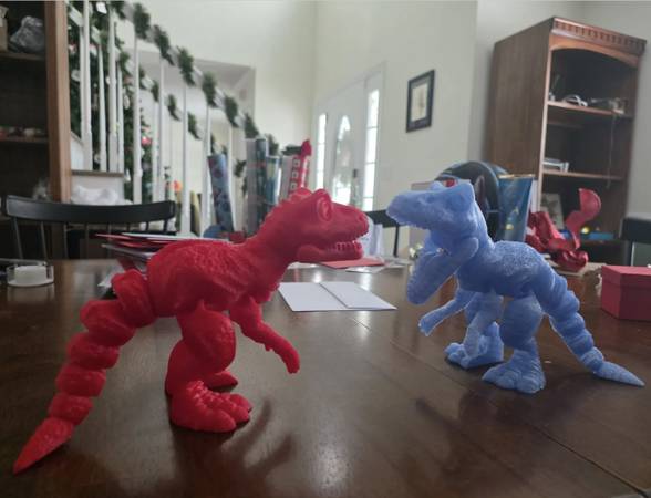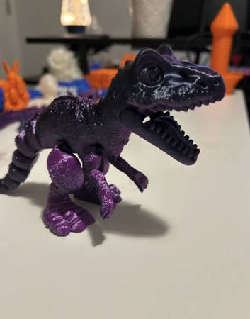 Flexible T Rex that stands about 6” tall. The head can swivel, the jaw moves and the tail is flexible.