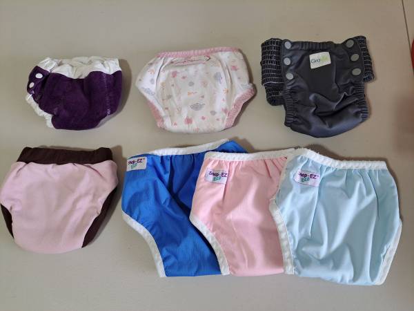 Reusable cloth potty training underwear. Little Beetle Learner organic cotton velour training pants with side snaps - size S. $5 BumUnders cotton and velour training pants - size S. $2 GroVia My...
