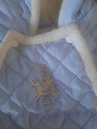 Nice, soft, like-new snowsuit, snap-up, lines, light blue. Text or leave voicemail.