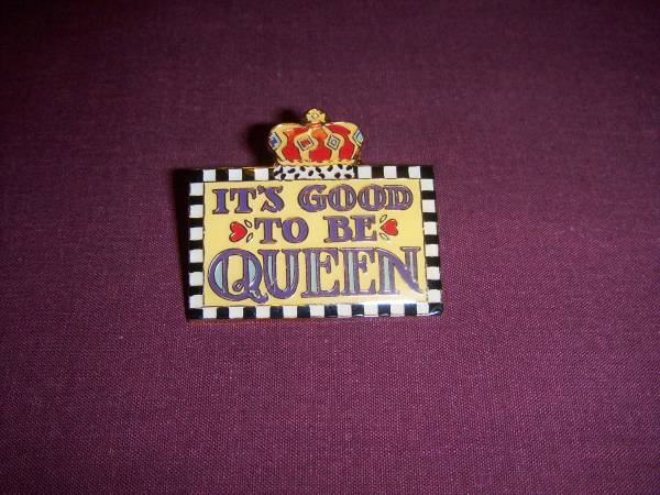 Selling this "It's Good To Be Queen" hat / lapel pin with Bookmark in removable plastic cover by Mary Engelbreit; a well-known graphic artist and children's book illustrator / author. In new condition; never used.