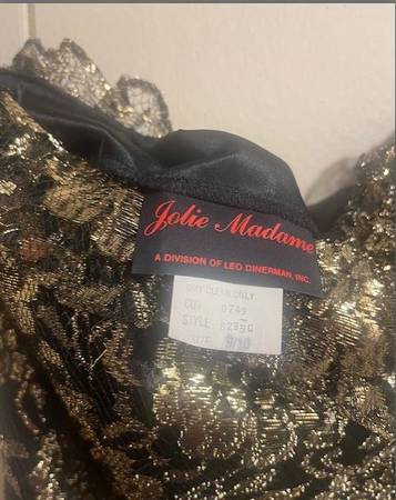 Are you ready to shine as bright as a disco ball? Here’s your opportunity to dance your way into the past with this gold lace and black satin party dress. All you’ll need to complete this far out look is big hair!