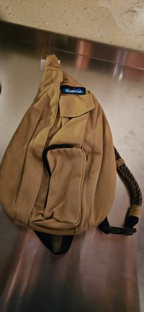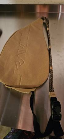 Kavu sling bag, tan color, like new without tags, 25.00 Cash' comes from a smoke free pet free kid free home, can't deliver or hold,great for anywhere use, Approximately 16"L x 9"W, + 3 zippered...