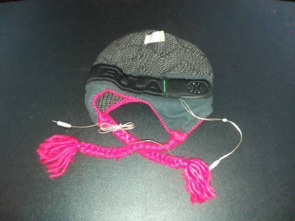 This Bula hat is brand new, never been worn, It has removable speakers so hat can be washed. It also has an inline volume control. Tassels are actually red, but appear purple in photos. I paid $35 + tax and was injured and can no longer snow ski. For LOCAL sale only, no trades or deliveries.