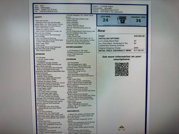 2019 Volkswagen Passat SE 2021 model year blends refined style, advanced safety, and efficient performance for Spokane drivers seeking value. Powered by a responsive 2.0L 4-cylinder gasoline engine with front-wheel drive, this Volkswagen Passat delivers composed handling and impressive fuel economy for daily commuting and highway cruising. This well-appointed SE features adaptive cruise control for relaxed long-distance travel, a sun roof to brighten the cabin, and premium wheels that enhance both ride quality and curb appeal. Inside, enjoy a thoughtfully designed interior with comfortable seating, user-friendly controls, and XM Radio for endless entertainment options on the go. A CARFAX Clean Report provides added confidence in the vehicle's history and condition, reflecting careful ownership and maintenance. With modern safety systems and driver assistance technology, this Volkswagen Passat prioritizes protection and peace of mind for you and your passengers. Located in Spokane, WA, this 2021 Volkswagen Passat SE is priced to sell and stands out as the best price in the area for comparable models. Whether you're upgrading your daily driver or seeking a reliable family sedan, this Volkswagen Passat delivers a compelling mix of features, efficiency, and comfort. Contact us to schedule a test drive in Spokane and see why this model represents strong value and smart purchasing.