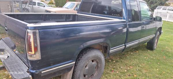 1994 GMC 1500 4x4 extended cab short bed 5.7 4spd auto transmission good tires,new front brakes newer battery. Stereo needs hooked up ,front electric bucket seats out of newer silverado Bed liner ,receiver hitch 219k miles runs good,cracked front windshield rebuilt washington title 3200 .00 show contact info