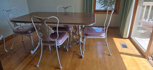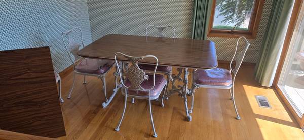 Quality 1960's Woodard wrought iron dining table and chairs with walnut table top and 2 walnut leaves.