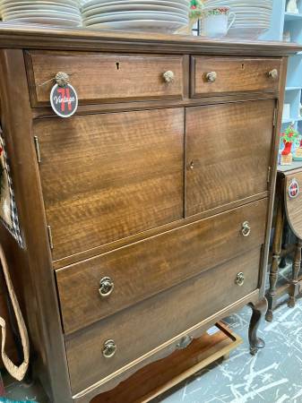 In excellent condition. Beautiful solid wood dresser with four dovetail drawers and large cabinet with clothes dividers. The top two drawers and cabinet area can be locked. (Original key comes with dresser). It also features curved queen Anne legs and wood casters. The height is 48H to the top of the dresser and 52H to the top of the backboard.The mirror chest on top of the dresser is not part of the dresser and is sold seperately. If you have ANY questions please call the number in the ad, I am not able to respond to messages. Thank you.