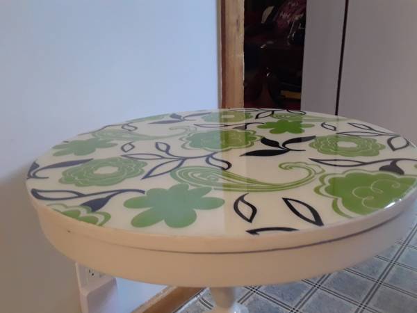 Handmade solid base finished in clean white. The 24β round top features a sealed, high-gloss floral pattern in green, black, and cream. Durable, smooth, and easy to clean. Built to be functional and a statement piece.