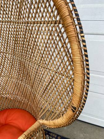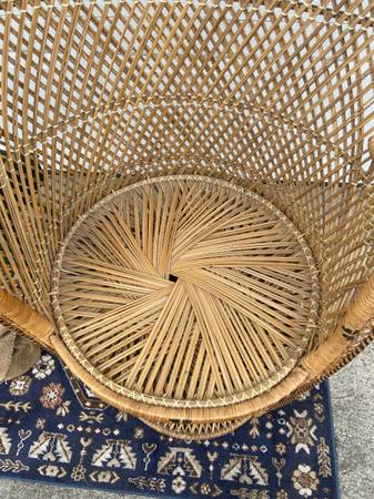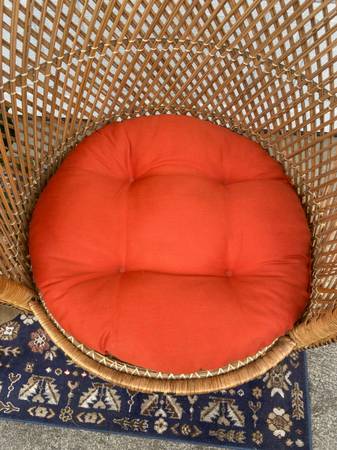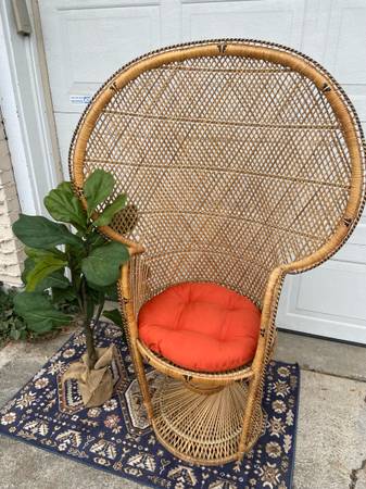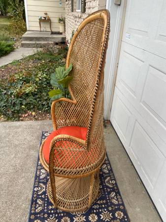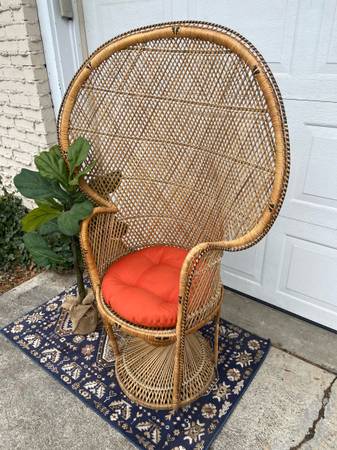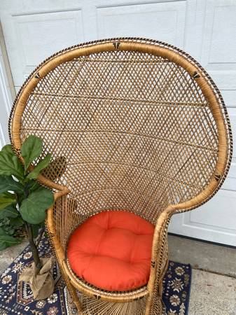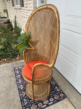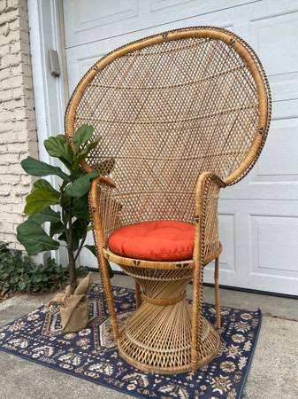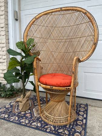 This vintage peacock chair is in such great sturdy condition! Has original cushion with tag still attached. It’s like it’s been frozen in time. Perfect to add to your boho collection or decor! Or use for a photo shoots! Easy to haul and maneuver. Located in the valley. Fcfs