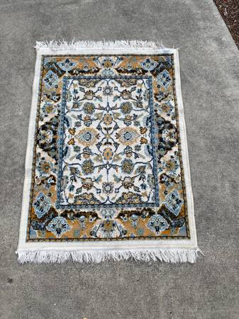 Small Area Rug $75 31”x45” (including tassels) Shades of cream, blue, sage, and light rust. One corner has a small discoloration and a bit of unraveling as shown in photos. Pick up in Northwest...