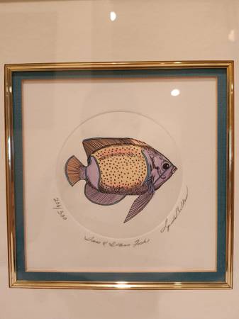 Embossed Fish etching by Linda Cullen in excellent condition, beautifully matted, brass frame, signed and numbered. (12 3/4"x 12 3/4") $75-