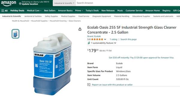Ecolab Oasis 255 SF - Industrial strength glass cleaner - concentrate 2.5 gallon this will make 30 gallons. $45.00 For more information please call or text 5O9.95I.8778