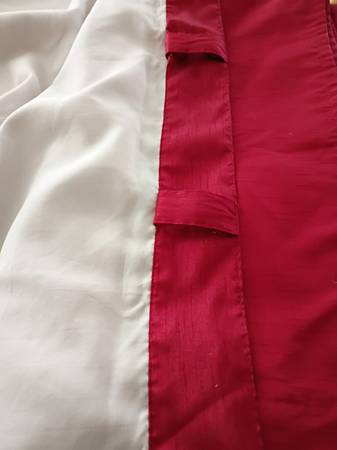 1 pair of lined red curtains. In excellent condition. 82in x 84in. (each panel is 41 in wide) Tab back. $20.00. 1 pair of sheer white and red panels. Never used, still in original packaging. 120 in...