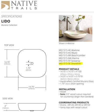 Murano Glass Sink, Shoreline Vessel, 15", handcrafted, Display model Made by Native Trails Model: Lido Shoreline MG1515-SE 14-3/4"X14-3/4"X4" In perfect condition, never used, showroom display...