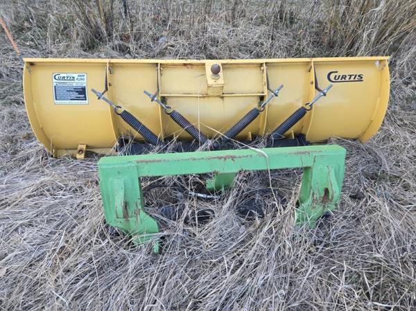 Curtis 8ft x 24 inch snow plow with hydraulic angle (uses tractor hydraulic) for a tractor with John Deere global mount/attach system. This plow works very well and has been used very little. The cutting blade is in good condition. This is not a lightweight plow. It also has a custom mounted 2 5/16 inch trailer ball on it. The previous owner did that, I believe for moving gooseneck trailers.