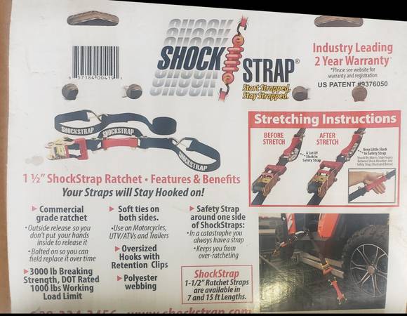 The breaking strength of our 1.5” wide straps are 3,000lbs. Built with a commercial grade ratchet, 1.5″ black Polyester webbing, integrated soft ties, oversized zinc chromate gated hook’s and our unique Shockstrap Bungee. We incorporated a Safety Strap, sewn into the strap that is behind the Bungee. It is there for 2 reasons: 1) if a catastrophic accident happened and the Shockstrap
