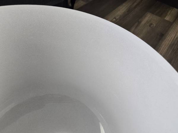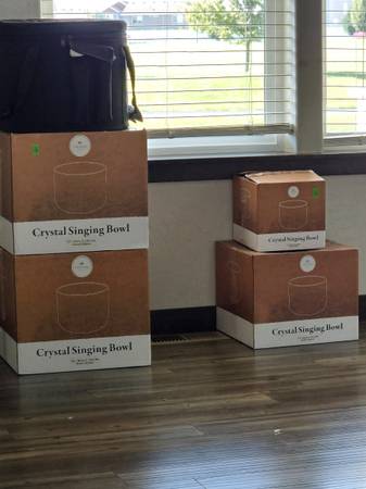 Five bowls in excellent condition (light rim wear, no chips or cracks). Includes padded carrying case for Bowl E, one rod, and one mallet. All but bowl E are in original box.