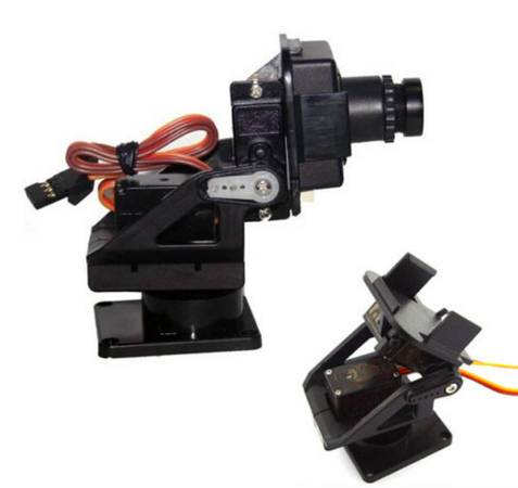 Plastic gimbal pan/tilt servo mount for camera up to 30 x 30mm. Total height is 70 mm. 2 good quality metal gear servos. Mount and motors only -- supply your own camera. New, tested, but never used otherwise. Pan servo is Henge MD260, up to 260 deg. rotation. Tilt servo is Turnigy XGD-11mb.