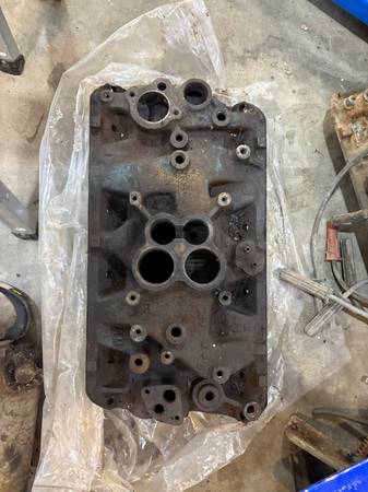 AMC 4 bbl intake mainifold. Needs cleaned, has baffle plate underneath. $50 Carb spacer and Matching Motorcraft 4 bbl. Carb available for $50 more.
