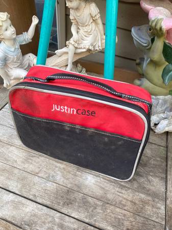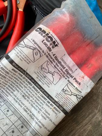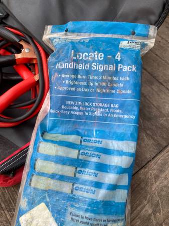 Automobile, emergency roadside kit with jumper, cables and signal flares with case for tools or whatever you want. $15. .