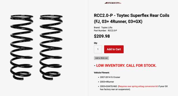Rear TOYOTEC 2" springs with maybe 20k miles on them. Fits a FJ cruiser, 4th and 5th gen 4runner and 2003+ GX470/460. Picture is spring compared to stock 4th gen 4runner springs. I ran them for a while and loved the stance, but now selling 4runner and want it back to stock for the sale. Stiffer than stock but great if hauling or need a lift.