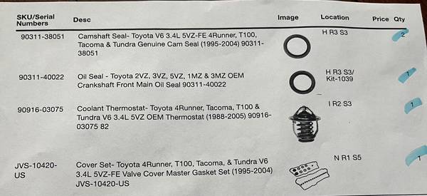 Brand New - everything still sealed in their bags. Water Pump Timing Belt for a Toyota 3.4L V6 4Runner Tacoma T100 Water Pump, Timing Belt, Gasket Kit, hydraulic tensioner, idler bearing, tensioner...