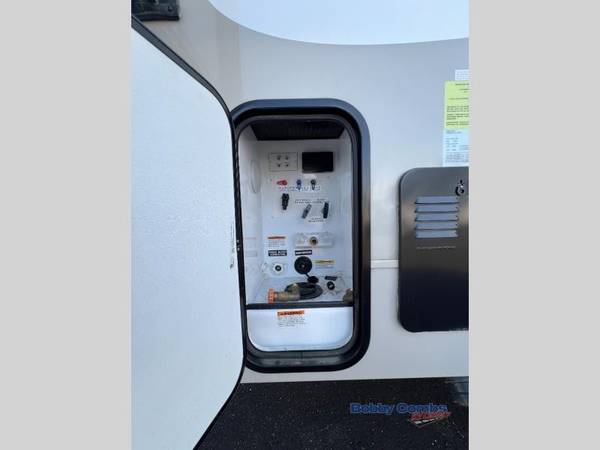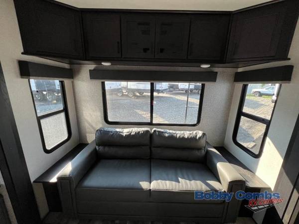 If you need to get some work done while you are away then this fifth wheel is perfect! It has a desk in the kitchen next to the large pantry so you can easily grab a snack. The dual entry bathroom is easy for everyone to access especially those staying in the front private bedroom and even has an area prepped to add an optional washer and dryer. Inside the bedroom is a wardrobe slide to keep your clothes looking nice and a queen bed with a power base for a good night's rest. You can easily prepare a delicious meal with the kitchen island and three burner cooktop then enjoy it at the table and chairs. Now that your belly is full, head to the rear tri-fold sofa or theater seating to watch your favorite movie on the 50" LED HDTV!
