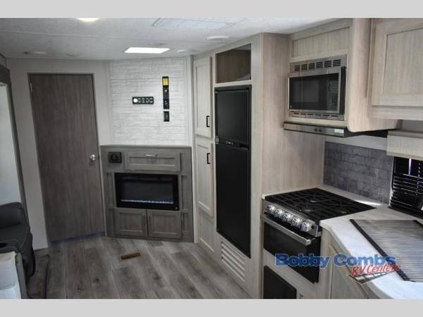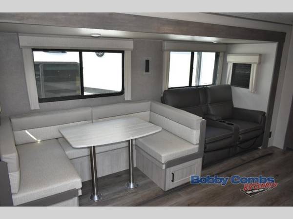 When you enjoy camping with your own accommodations and space for the whole crew, hitch this trailer up and head to the campgrounds! After loading everything easily thanks to the dual entry doors and all the interior and exterior storage, you will have no worries that you left anything behind. The electric awning is easy to set up, like the large slide out, and the awning offers multicolor LED lights to choose from by using the remote. When you are outside the cook might like to make a meal using the outside camper kitchen. The interior kitchen offers full amenities including a pantry, and everyone can enjoy the angled entertainment center. There are double-size bunks with a ladder for the kids and a walk-around queen for the owner to sleep on, plus furniture in the living area that doubles as additional sleeping space!