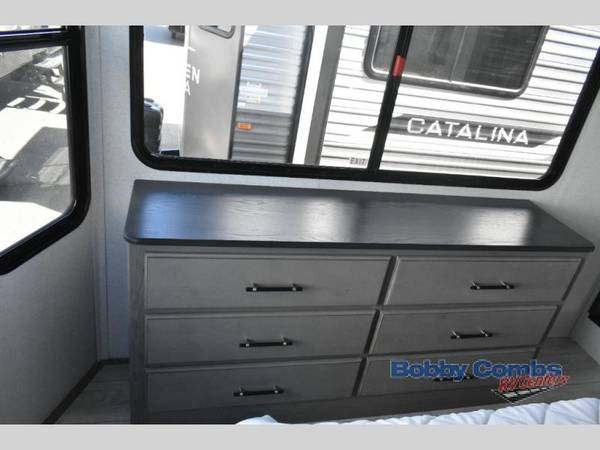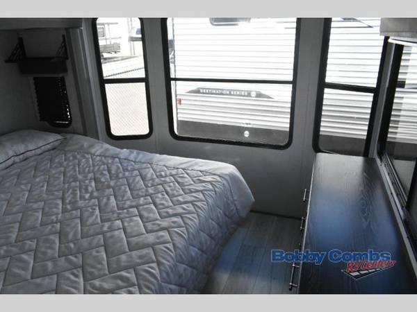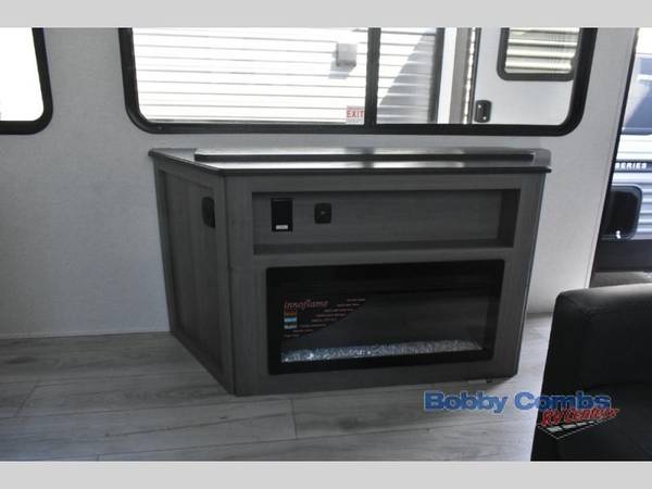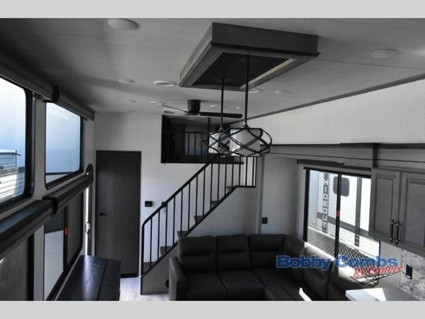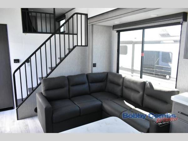 This destination trailer is so accommodating, you may just want to camp all year long! The owners will have the front bedroom all to themselves with a king bed slide out, dresser, and master closet so everything has a place. Above this room is the front loft with stairs that includes three 39" x 74" beds/sleeping spaces and storage shelves, making it perfect for little ones! The spacious full rear bath includes dual bath sinks, a large 48" x 30" shower with a seat, and a closet with washer/dryer prep if you want to add these appliances. And just outside the bath, you'll find the second set of stairs that leads to the rear loft with a 54" x 81" bed, an entertainment center, and storage shelves for your guests. During the day, everyone can meet in the combined living area and kitchen that features a large slide for more space, a sectional sofa, a kitchen island with four barstools, plus an entertainment center with a fireplace!