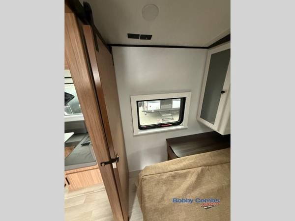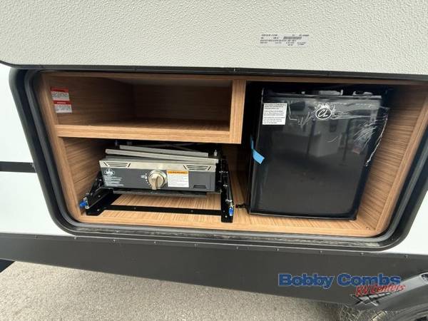 Trips to the lake with a larger group are made easy in this spacious travel trailer! The double-size bunks include a flip-up bunk for added storage, and there is a rear cargo door here so you can easily load gear from outside. The full bath is conveniently located right by the bunks for easy nighttime use, and the pantry is also close by if anyone needs a midnight snack! You will sleep like a baby in the front bedroom that includes a queen bed and dual wardrobes to keep your clothes tidy. In the morning, everyone can meet in the combined living area and kitchen while the chef makes breakfast on the three burner cooktop, and there is a U-shaped do-more dinette table to dine at. If the weather is nice, the chef just may want to cook on the outside kitchen with a griddle, and everyone can sit at the picnic table under the 15' awning!