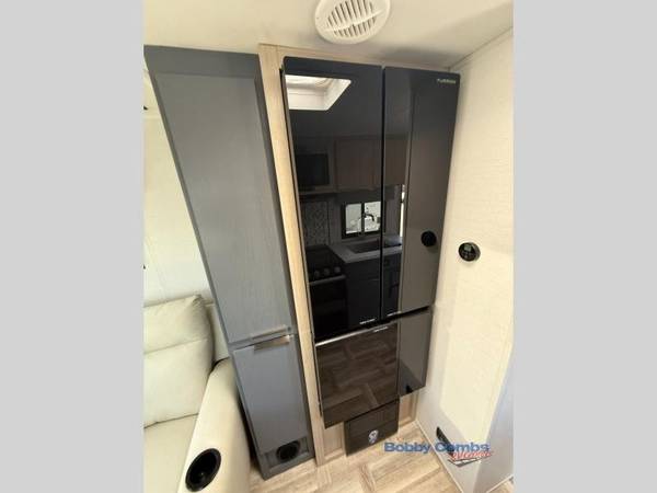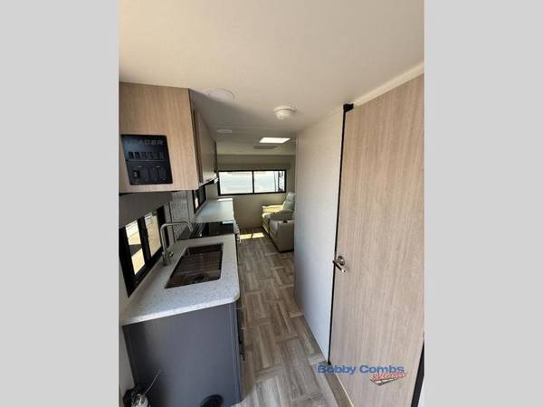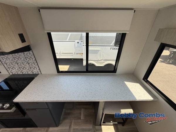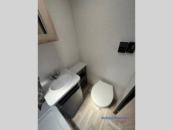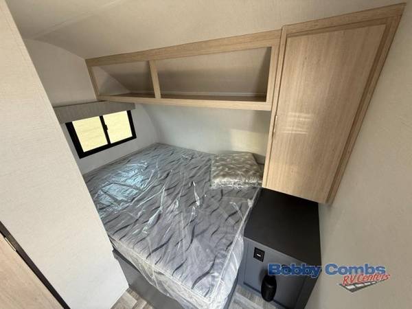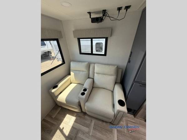 This couple's trailer is perfect for weekend trips to the lake! You'll love waking up each morning on the front queen bed instead of on an air mattress, plus there are overhead cabinets and a wardrobe for your things. The theater seating provides a place for you to relax in the evenings, and the bartop with two stools will be the perfect place to dine together. Making meals will be easier than ever with a three burner cooktop and microwave oven, plus there is a refrigerator and pantry for food storage. And don't overlook the exterior with its pass-thru storage and 15' awning!Â