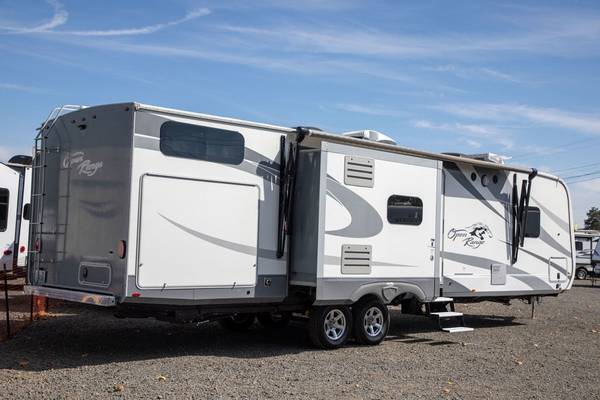The Open Range fifth wheels and travel trailers are designed with the seasoned traveler in mind. You'll find floorplans designed for extended use that maximize space while keeping weight to a minimum. Wide body construction and 42" deep slides lend a sense of space that's just not achievable with lesser products. From brand name appliances to Corian® counter-tops, you'll find feature content that the accomplished RV owner will appreciate. Rugged construction, top quality materials and leading edge innovation. If you're serious about the RV lifestyle, these products are a perfect fit.