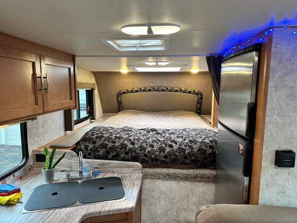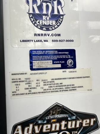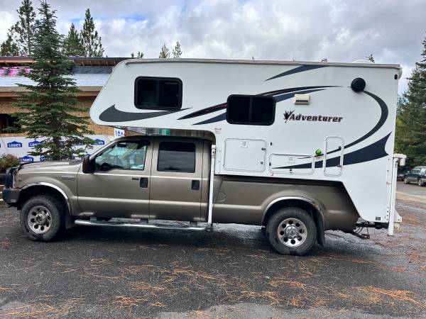 Adventure 89 RB on Ford F250 three-quarter ton XLT super duty triton V10 engine, back up camera 15,000 pound winch front and rear tow ball hitches Buckstop custom bumper Ford truck is a 2005 adventure camper is a 2018