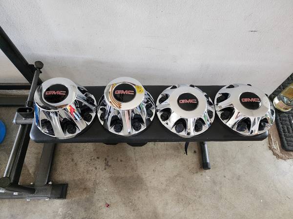Set of GMC Factory OEM Dually Chrome Center Caps, Rear Part Number 9597808, Front Part Number 9597803